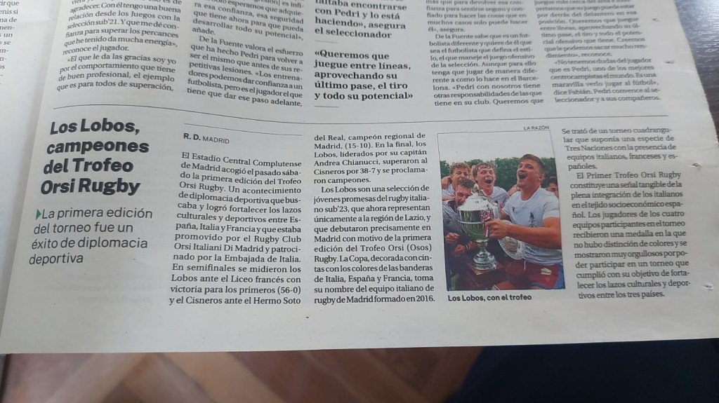 10 junio, 2024 by limrugby Trofeo Orsi Rugby en la prensa española Sin categoría Deja un comentario Hoy es lunes y tras la resaca del trofeo Orsi, empezamos a recopilar las muchas publicaciones que hemos visto en la prensa, española e italiana, sobre el #trofeorugbyorsi Este es un artículo de la sección deportiva de La Razón Compártelo: Haz clic para compartir en X (Se abre en una ventana nueva) X Haz clic para compartir en Facebook (Se abre en una ventana nueva) Facebook Me gusta Cargando... Relacionado